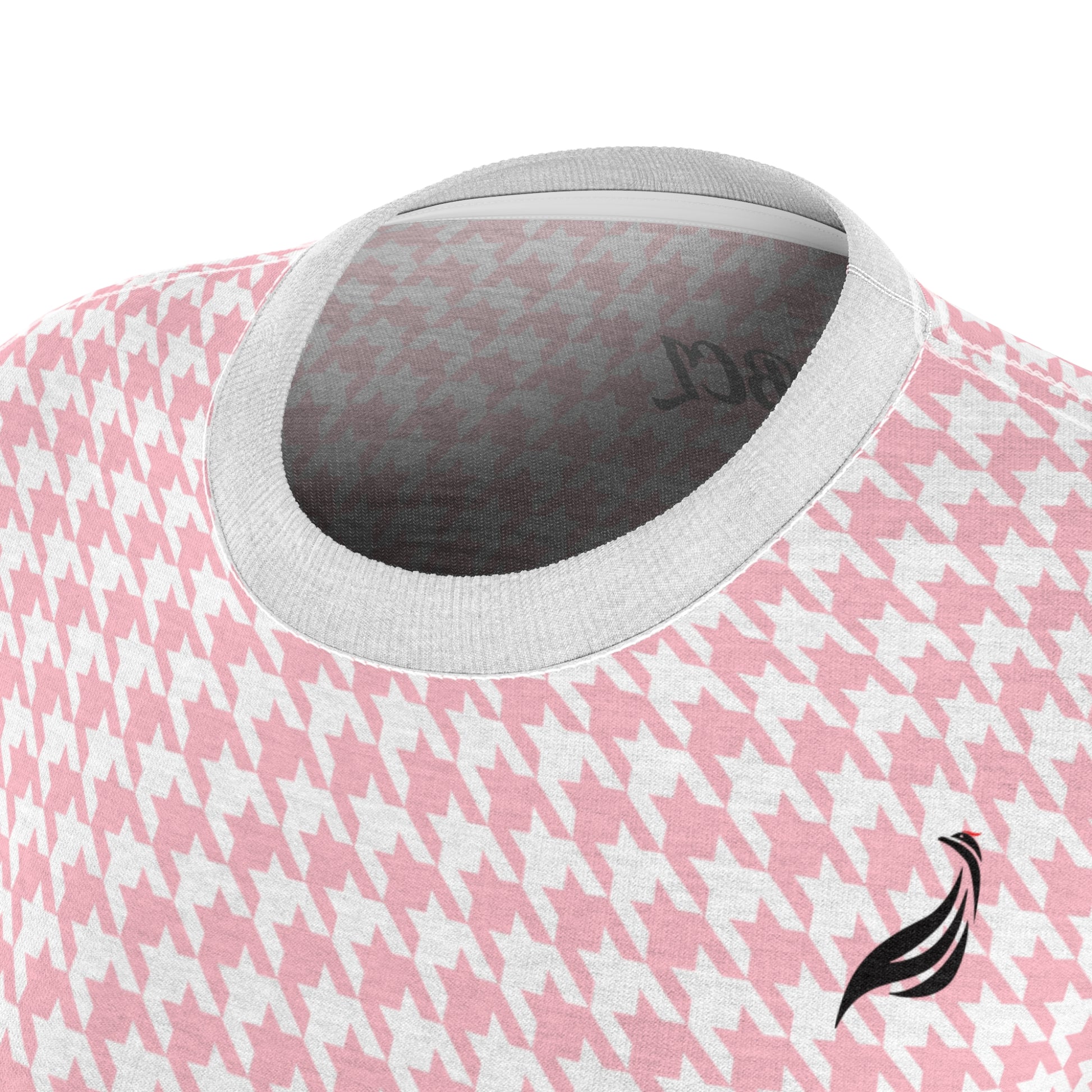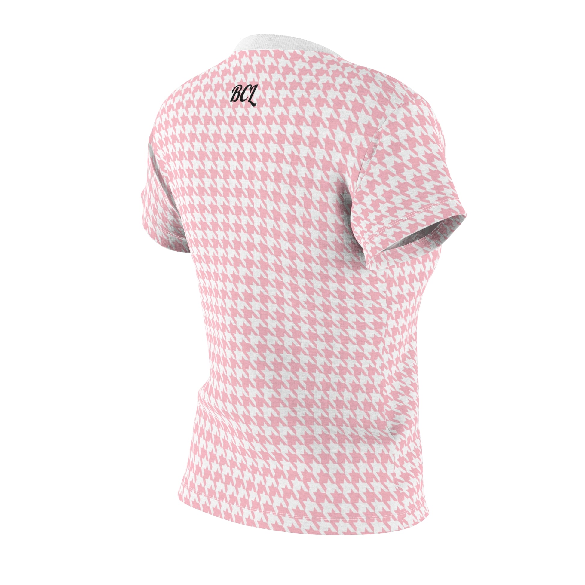 Elevate your wardrobe with the Pink Houndstooth Elegance Women's Tee, where fashion meets comfort, and make a bold statement that aligns with the values of Blackcock Clothing Label – resilience, power, and determination.