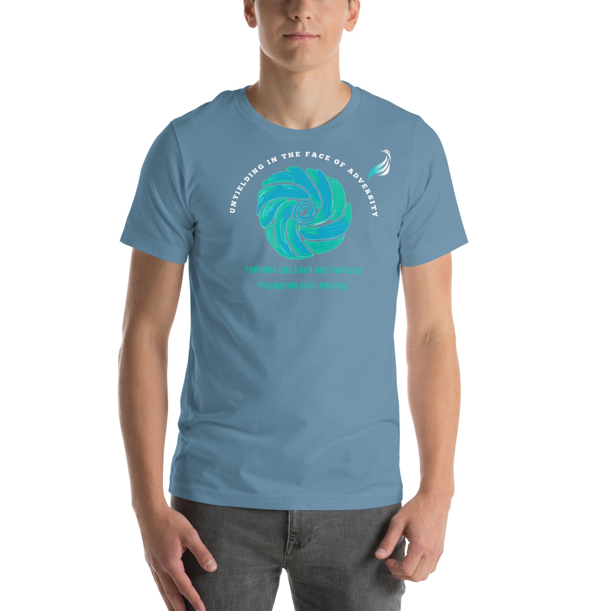 Introducing the Wear Blue Day T-Shirt from Blackcock Clothing Label. Various shades of blue shirts are available, featuring a blue pinwheel symbol in the center, representing National Child Abuse Prevention Month. The pinwheel is surrounded by our slogan “Unyielding in the face of adversity” in bold white lettering. The words “Thriving Children and Families: Prevention with Purpose” are written in blue below.